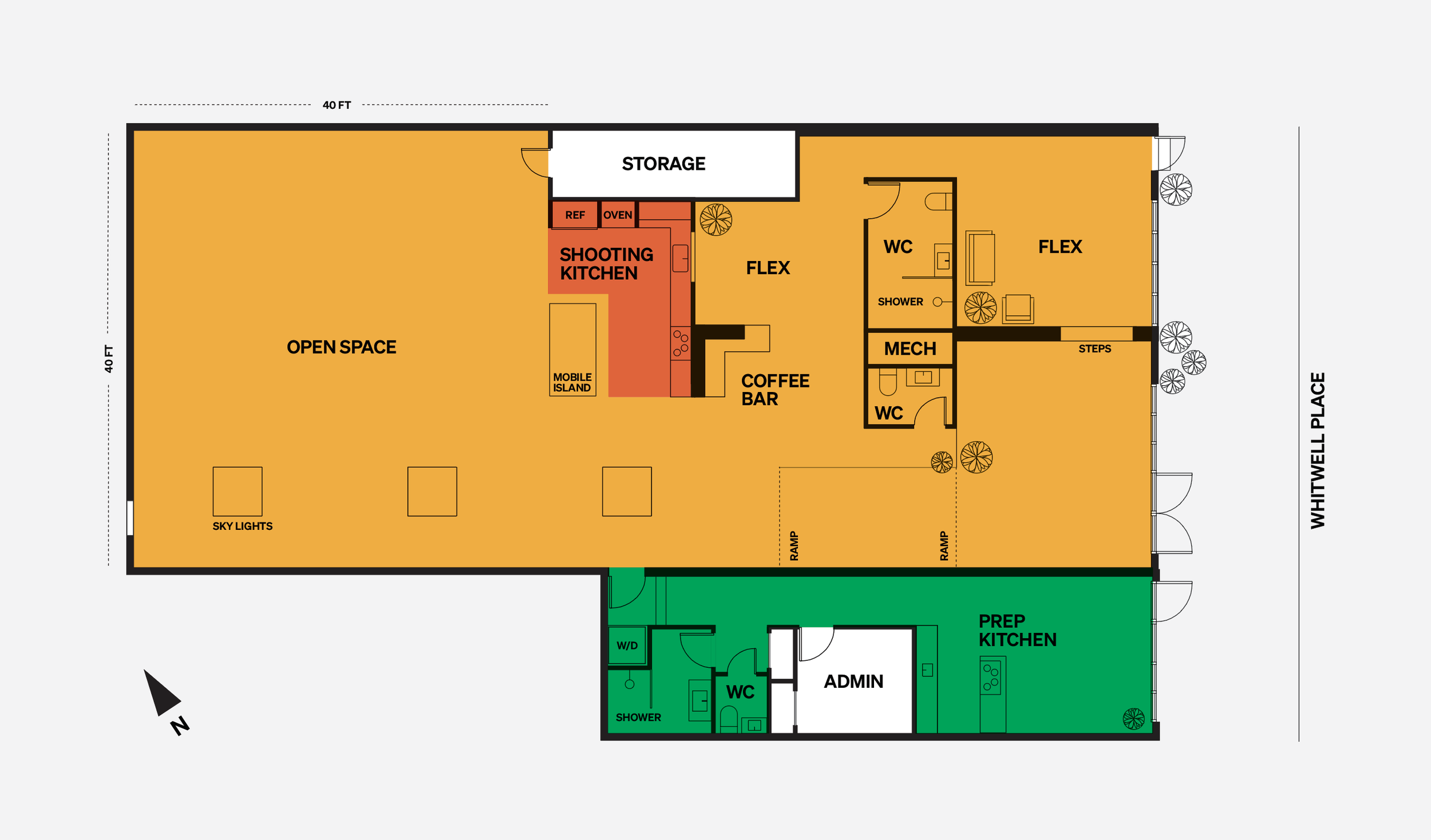 The main studio is a 3,600 sq. ft. space that includes multiple flex areas, two bathrooms, a 40 ft. x 40 ft. open studio area.